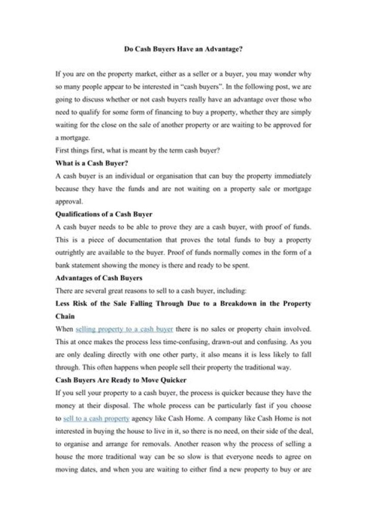 Cash buyers typically come chain-free as they don't have a property to sell in order to make the purchase – so there is no risk of additional or external influence from related transactions causing the property transaction to fail.Is paying cash for a house an advantage?