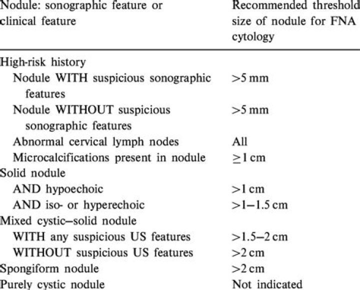 FNAB should be considered for nodules ≤10 mm diameter only when suspicious signs are present, while nodules ≤5 mm should be monitored rather than biopsied.Is a 2.5 cm thyroid nodule large?
