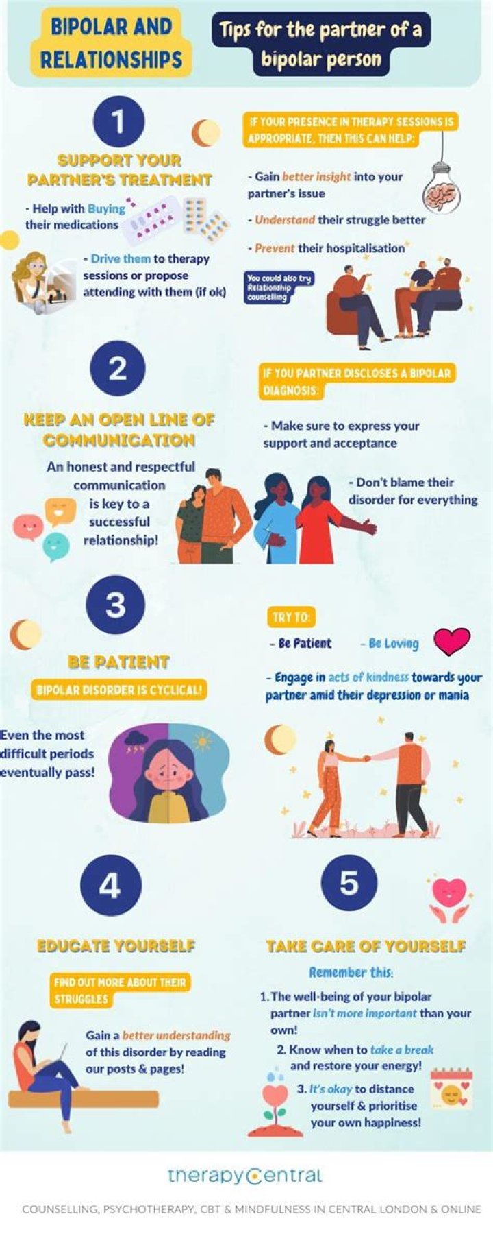 You can absolutely have a healthy, happy relationship with a partner who has been diagnosed with bipolar disorder. The condition may bring both positive and challenging aspects to the relationship, but you can take steps to support your partner and to help them manage their symptoms.What are 5 signs of bipolar?
