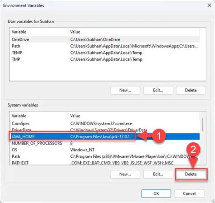 - Select the environment variable you want to delete and click Delete.
