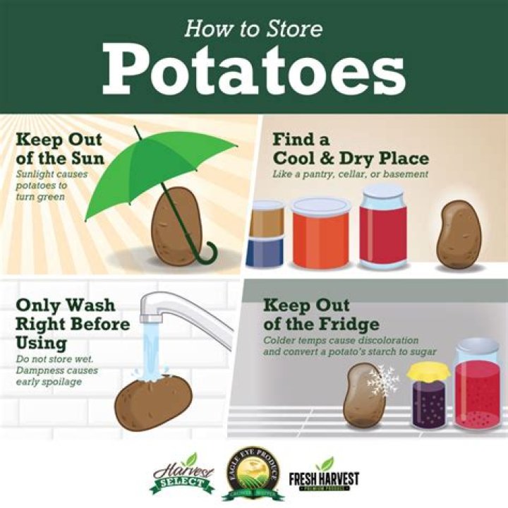 The key is to store potatoes in a cool dry place, like in the cabinet of a pantry, in a paper bag or cardboard box. It's important to keep potatoes at the cool, ideal temperature (but not, surprisingly, the fridge) to prevent them from turning green, getting soft spots, or pre-maturely sprouting.Should I wash potatoes before storing?