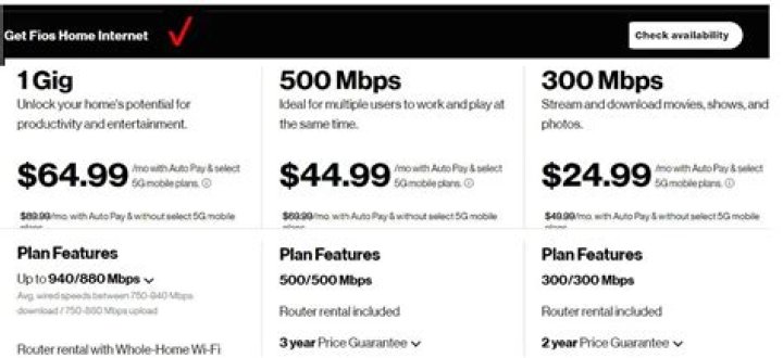 Verizon offers three service tiers for Fios. The cheapest offers up to 200 Mbps of speed for $39.99 per month, while the mid-tier option offers up to 400 Mbps for $59.99 per month. Fios' best plan, the Gigabit connection, costs $79.99 monthly and offers up to 940 Mbps of download speed and 880Mbps of upload speed.