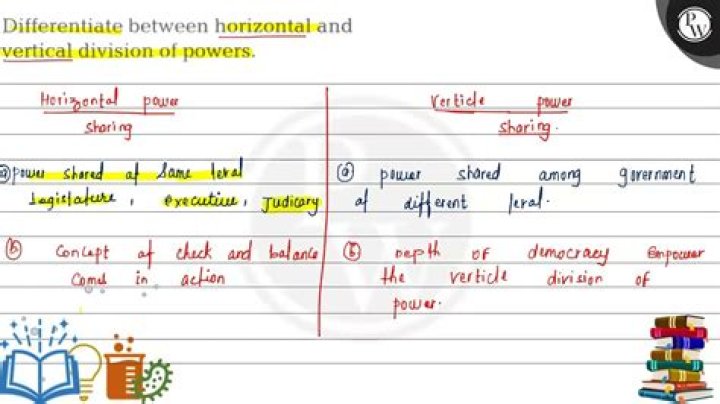 Vertical division of power refers to sharing of power among different levels of the government - union, state and local government. In this division of power, the local government will work under the union or the state government and the state government will work under the union government.What is horizontal power-sharing class 10?