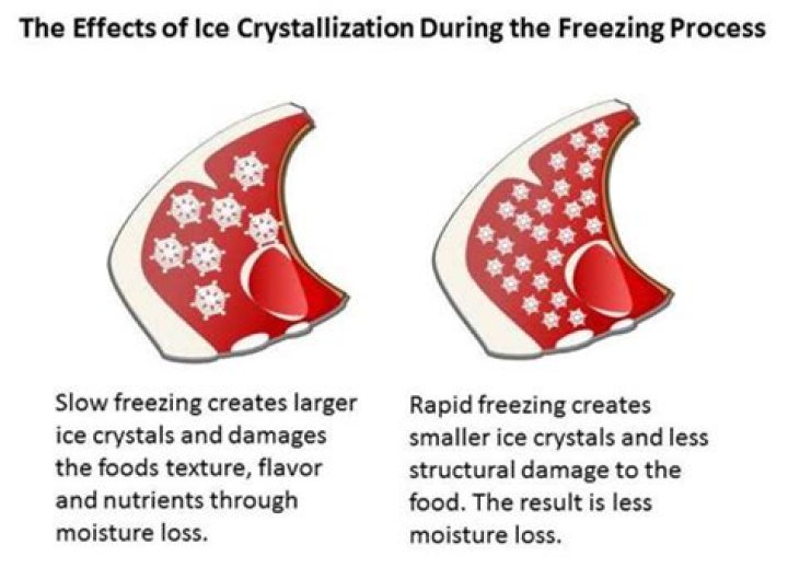 Slow freezing produces large ice crystals that punch through cell membranes. As a result, when foods with large ice crystals thaw, there is more dripping and loss of liquid. Small crystals are unstable and over time grow to form larger crystals.What is the meaning of large ice crystals on frozen food Servsafe?