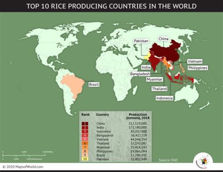 About 85% of the world's rice production comes from just 10 countries. Just 10 countries are responsible for almost 85% of the world's rice production. China and India are the top two producers, accounting for more than half of the global total. All the top 10 producers are located in Asia, except for Brazil.Does Sri Lanka produce rice?