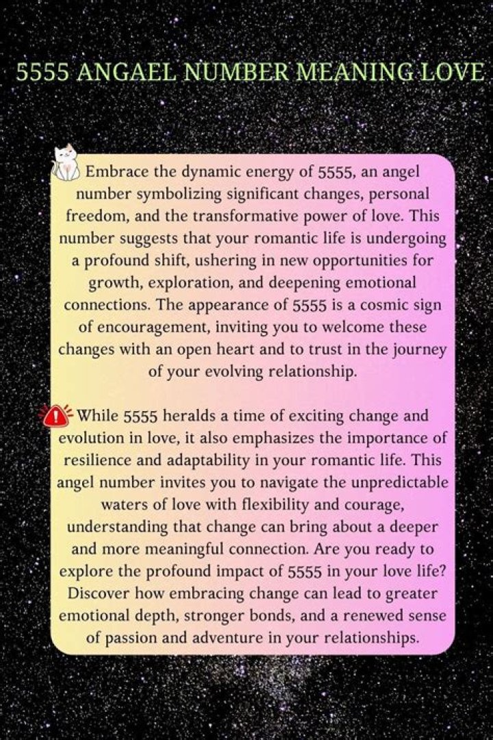 If you're single and keep seeing 555, it could, of course, mean the change heading your way is a new love interest. It could, however, also mean that right now, you're meant to embrace changes in general, with love being an afterthought. This number represents change, but it also represents freedom and adventure.Angel Number 5555:: Welcome New Changes In Your Love Life.✨? #angelnumbers