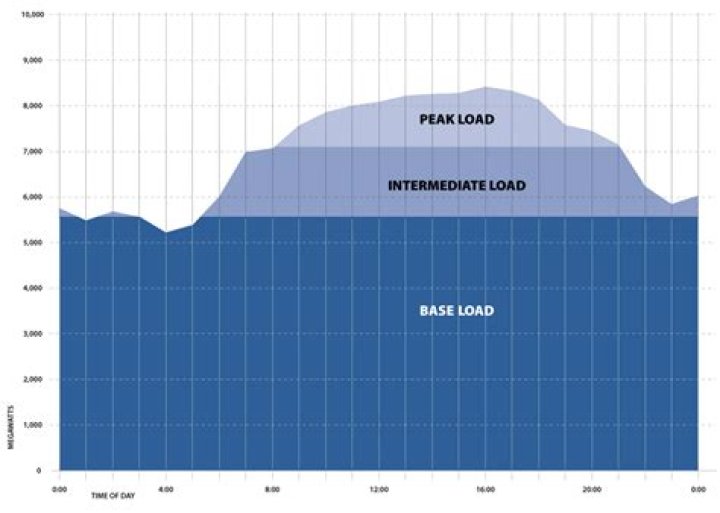 Power plants that are used during the transition between base load and peak load demand. These plants are not as difficult to ramp up as base load plants or as expensive to operate as peak load plants. Wind and solar power plants fall in the intermediate category.What is meant by base load intermediate load and peak load?