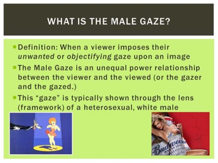 The male gaze refers to when a heterosexual man ogles or stares at an objectified woman in a sexualized way. This can be seen through media, such as advertisements and television shows, where women are represented as objects for men's use and pleasure.What is the male gaze in literature?