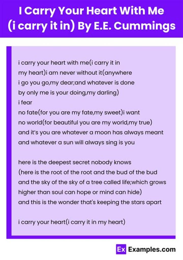 E. E. Cummings's “I Carry Your Heart with Me,” often described as one of the most talked about love poems of the modern times, was first published in 1952. In this poem, Cummings focuses on the power and unity of love, and how love connects not just two individuals but also the world at large.What figurative language is i carry your heart with me?