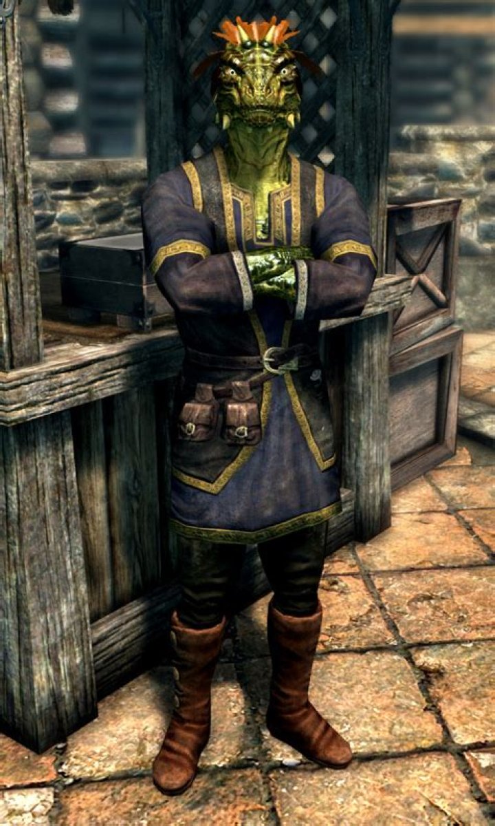 Madesi is an Argonian merchant in Riften that sells jewelry. You'll first encounter him in the central marketplace, but soon after Brynjolf of the Thieves' Guild will ask you to steal an item from Madesi's strongbox and plant it on Brand-Shei .