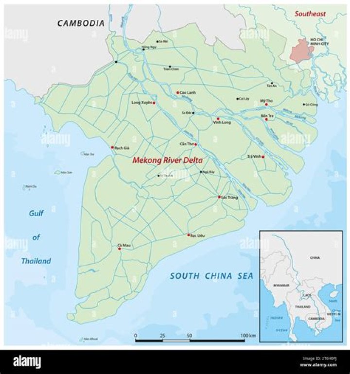 The Mekong's drainage basin covers 795,000 km²23% is located in Thailand, 21% in China, 20% in Cambodia, 8% in Vietnam, and the remaining 3% is in Myanmar.