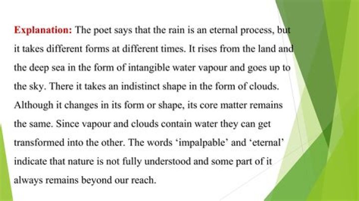 The rain tells the poet that it rises upwards towards the sky in the form of vapour where it changes its form (condenses into water droplets). It also says that although its form gets changed, it still remains the same.What has been described as impalpable and why describe the word impalpable?